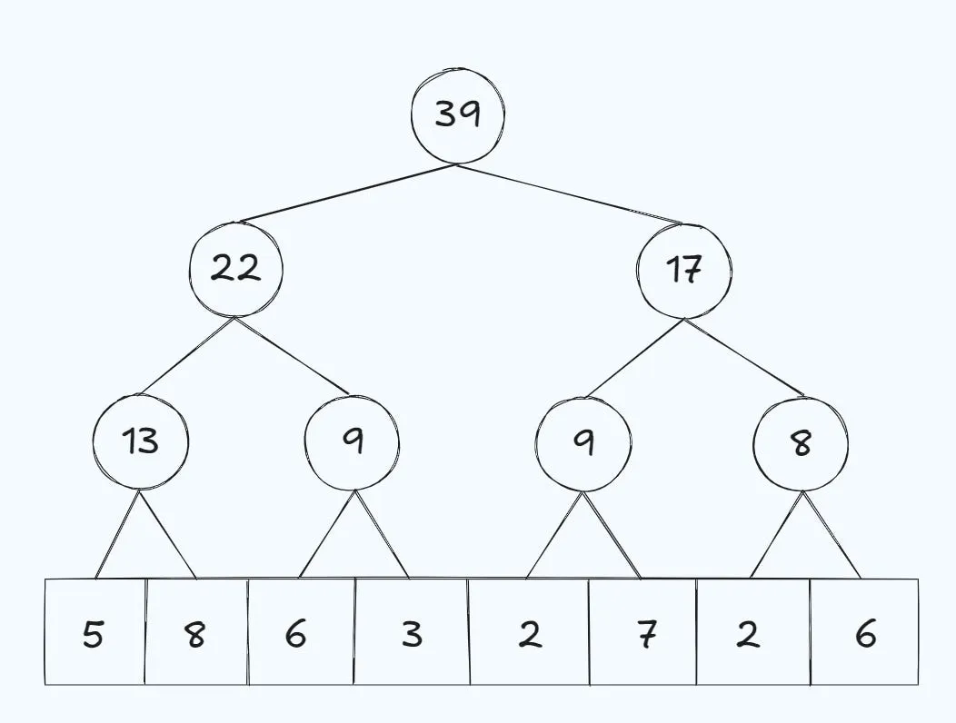 Keep in mind that this tree is only meant for sum queries it won’t work for minimum or maximum queries, but we’ll see how to do those later