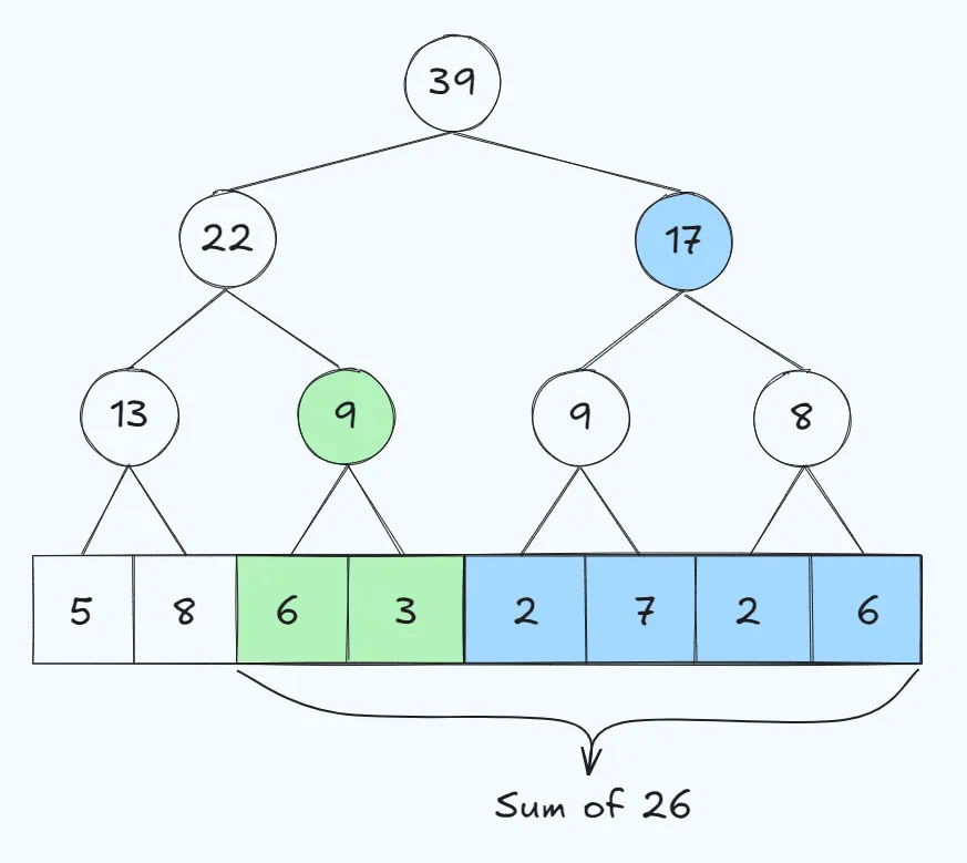 Since we’ve computed the sums for both of the child nodes we can basically split up the array into ranges for which we’ve computed the values