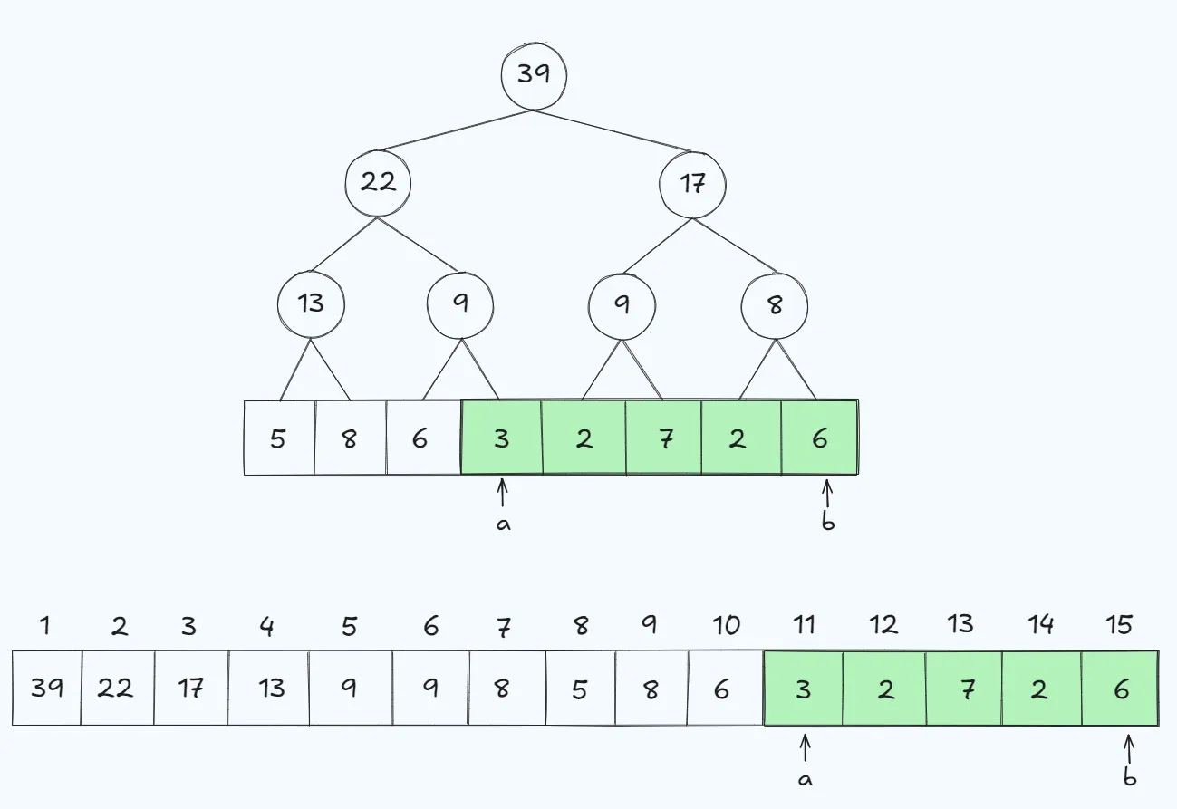 Let’s say we want to find the range from index 3 to 7, in that case a would become 11 and b would become 15 since the length of the array, n, is 8: